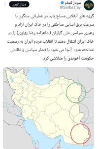 اما چطور رخ خواهد داد؟! اخیرا یکی از مزدوران اسلامیست عضو تحریرالشام در سوریه که گویا از اهل سنت ایران است در شبکه ایکس با نام «سرباز گمنام» فعالیت میکند (از همان سالهای ابتدایی جنگ داخلی سوریه عده زیادی از اهل سنت افراطی و تکفیری ایران به سوریه رفتند و به گروههای مختلف از جمله داعش و القاعده ملحق شدند و خود را سازماندهی کردهاند برای چنین زمانی) علنی طرح های امپریالیستی را که در راستای شروع جنگ داخلی است بیان کرده در یکی از مطالبش نقشه ایران را نشر داده و سه منطقه در شرق ایران را علامت گذاری کرده است که میشوند سه استان فعلی خراسان رضوی، خراسان جنوبی، سیستان و بلوچستان و اشاره کرده است که نیروهایی قصد دارند به این سه استان هجوم بیاورند و این مناطق را اشغال کنند، دقیقا مانند همان طرحی که در سوریه پیاده شد.