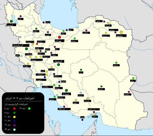سایر نقاط (قزوین، فردیس کرج، بهبهان، مشکان فارس، اسلامآباد غرب، زاهدان، بندرعباس و شهرهای کوچکتر): گسترش به مناطق حاشیهای و شهرهای کوچکتر ادامه یافت، با هستههای اولیه اعتراض، آتش زدن اموال دولتی و شعارهای مستقیم علیه رهبر رژیم. در برخی نقاط مانند لردگان و کوهدشت، مراسم خاکسپاری کشتهشدگان به تجمعات ضدحکومتی تبدیل شد.